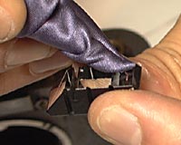 Wrap the end of tweezers with a silicon cloth and clean the viewfinder unit with them.