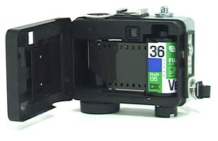 Pull down the rewind crank, then insert the film cartridge. Put back the rewind crank and close the rear cover.
