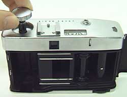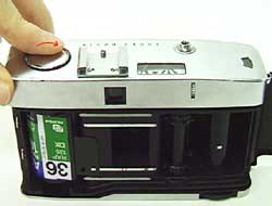 Pull up the knob further, and insert the film in the left room. After that, return the knob to fix the film.