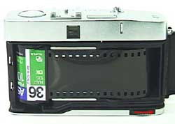 Insert the film tip in the socket of the take-up spool, and rotate it so that the film rolls around it. And close the rear cover. *The red arrow on the figure above shows the film wind knob.