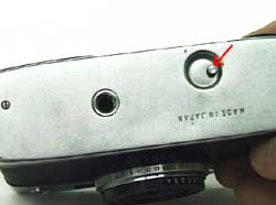 Rewind Pop up the rewind knob first. Then, depress the R-button on the camera bottom, and at the same time turn the knob in the direction of the arrow.