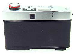 Pop up the rewind knob first. Then, depress the R-button on the camera bottom, and at the same time turn the knob in the direction of the arrow.