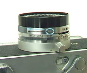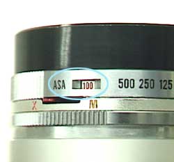Set the film speed with the lens-bottom lever encircled. The film speed is indicated in the lens-top "ASA" window.