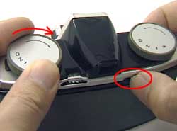 Rewinding the film When rewinding the film, move the lever (in the red circle) to the right, and at the same time turn the rewind knob in the direction of the arrow.