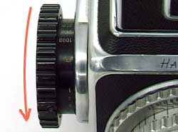 The film wind knob is also used to set the shutter speed. Pull out the film wind knob, and turn it clockwise to set the shutter speed. Note: This knob doesn't turn the other way.