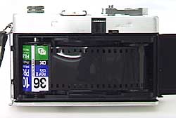 Insert the film cartridge in the left room. Then, slide the leading tip in the gap of the take-up spool. Rotate the spool a few turns so as to roll the film around the spool.