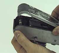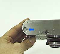 To load the film, open the rear cover by depressing the button (where the blue-colored arrow points in the picture) on the base plate.