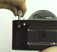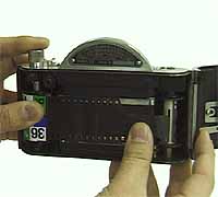 Raise the rewind knob and insert the film cassette. Pull down the rewind knob and slide the film leading tip in the take-up spool.