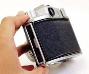 Load the film For loading the film, open the rear cover first by pulling down the rear cover safty latch on the camera side.