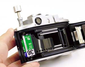 As shown in the figure above, pull up the rewind knob and insert the film cartridge in the left room. Once the cartridge is set, return the rewind knob to fix it.