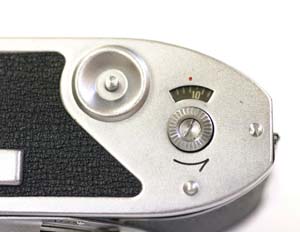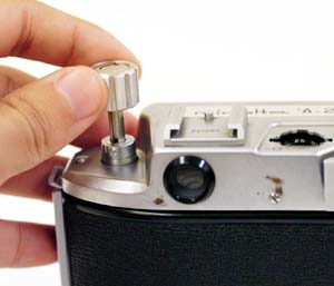Rewind Depress the R-button first. Then, pull up the rewind knob once and turn it in the direction of the arrow to rewind the film.