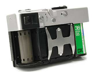Make sure that the perforations are rightly engaged with the sprocket. If not, engage them with the sprocket here. Then, close the film pressure plate, and put back on the rear cover.