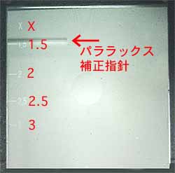 次に近接撮影の時の露光補正です。ファインダー内左上から、パララックス補正用の指針が出てきます。 (尚、この指針より上の部分は写りませんので注意してください。) 近接撮影の場合の露出補正ですが、例えば、適正露出値が1/125秒、F11の時 指針が2をさしている場合:1/125秒、F8(1/60秒、F11) 指針が3をさしている場合:1/125秒、F8と5.6の間(1/60秒、F11と8の間)