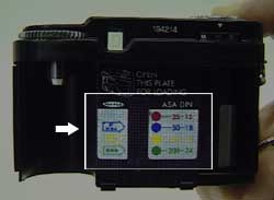 裏蓋を外すと、フィルム圧板に宝石の色と各々が示すISO感度値が表示されてるので、 感度を設定する時はここを参照にします。