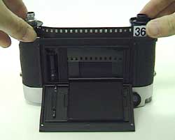 ボディ裏のカバーを開いて、フィルムを引き出しながらボディに挿入します。