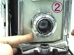 シャッターを空撮りしてシャッターの調子を確かめたら、フィルムホルダーから引板を引き外します。 1でシャッターをチャージし、2でレリーズします。 3はシンクロ接点4はレリーズネジで、これは使用例です。