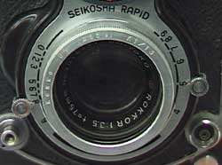 カメラに向かって右側に絞りをあらわす4〜9までの数字、左にシャッタースピードを示す0〜9までの数字が記されているので、このふたつの数字の和と、先程の露出メーターが示す数字が同じになるようにセットします。 例えば、今メーター部の数字が13を示していたとすると、右側の数字を5とすれば、左側の数字を8にセットすればよいということです。