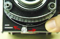 ピントは、ファインダーを覗きながらこのレバーを左右に動かして行います。1mから無限までの目盛が刻まれています。