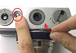 フィルムの巻き上げは、ボディ底面のフィルム巻き戻しボタンを押しながら、巻き戻しクランクを矢印の方向に回して行います。