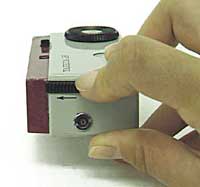 フィルムを装填するためにフィルム室を引き出します。ボディサイドに付いているレバーを矢印の方向に押すと